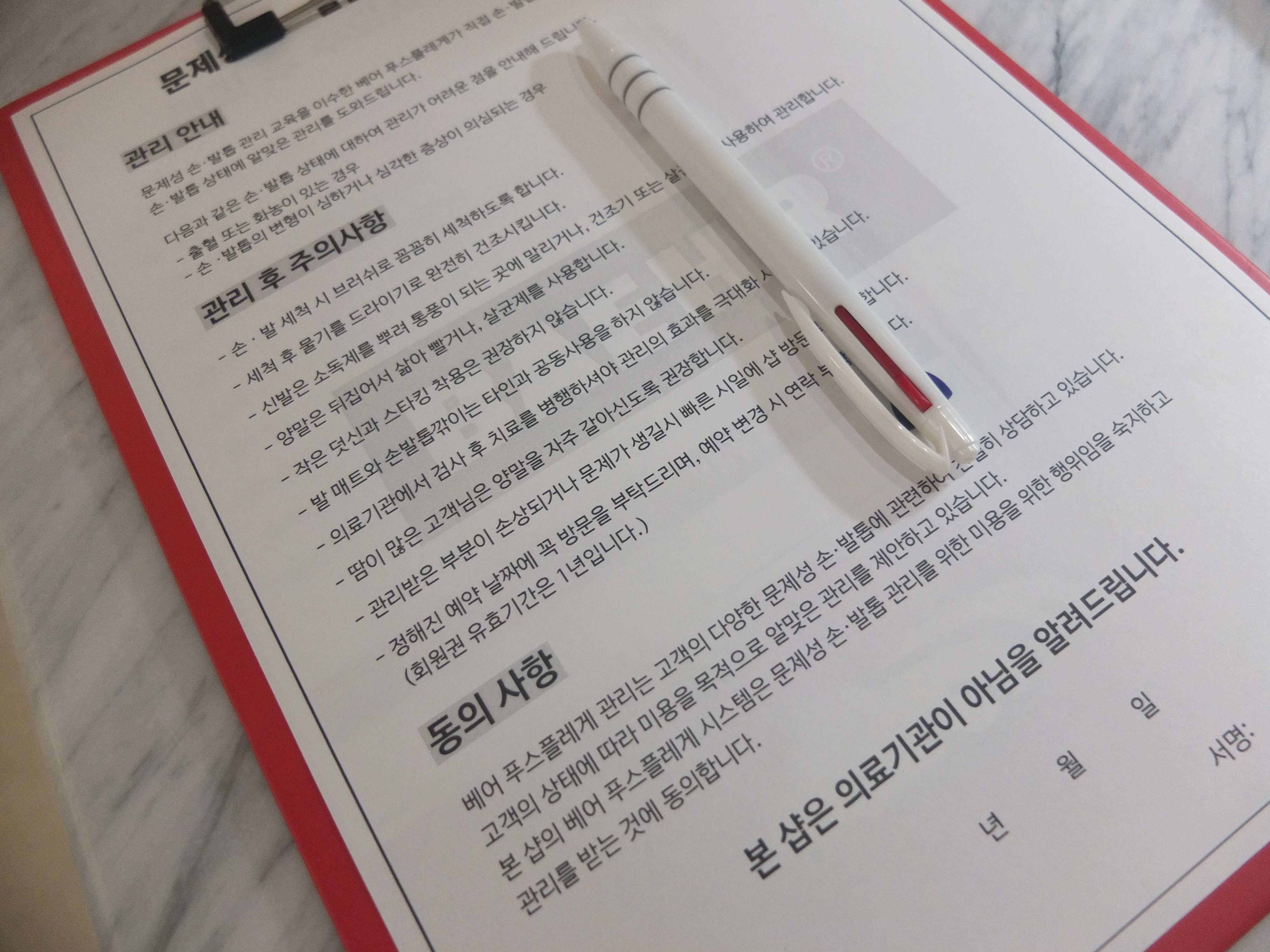 먼저 관리 안내문을 읽고 서명하는 것으로 관리는 시작된다. 베어 푸스플레게 관리로 무좀발톱을 관리하는 샵인데 고객 상태에 따라 적절한 관리를 제안하고 관리한다.