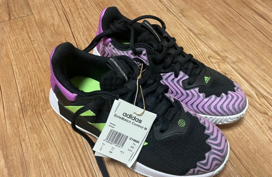 이번에 선택한 테니스화는 아디다스 솔매치 컨트롤 M GY 4690 (260 사이즈). 가격은 약 127,200원으로 구매했다. 평소에는 255 사이즈를 신는데, 이 제품은 정사이즈로 가면 약간 작게 느껴지는 편이라 한 사이즈 업을 권장한다. 테니스화는 브랜드마다, 또 같은 브랜드라도 제품별 착화감이 다르기 때문에 직접 신어보고 구입하는 게 가장 좋다. 나 역시 착화해 본 후 사이즈를 올려 구매한 덕분에 코트 위에서 발이 조이지 않고 훨씬 편안했다.